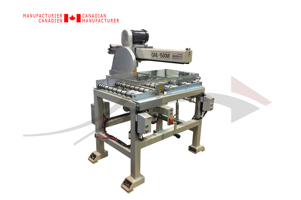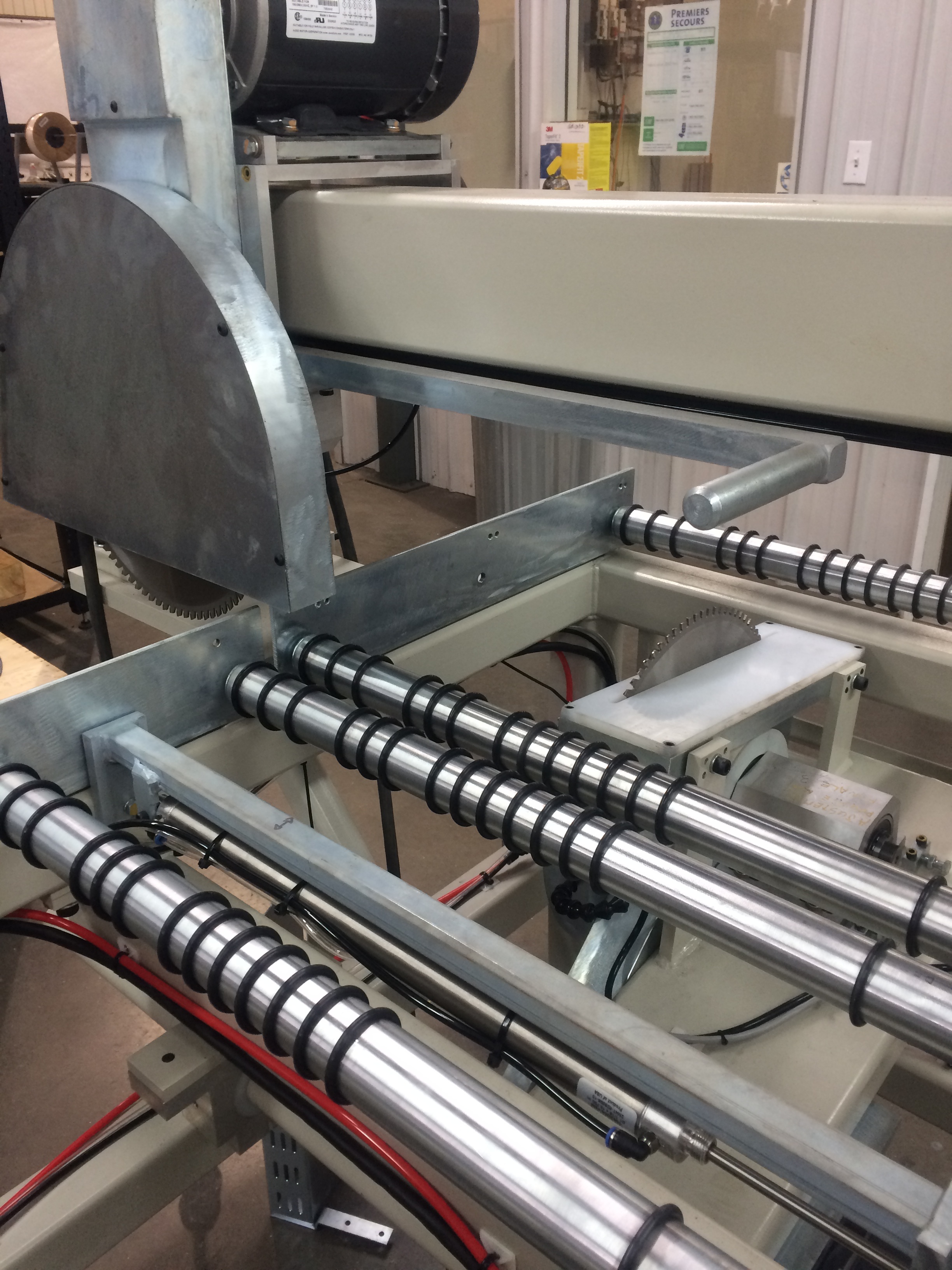 Scie radiale commerciale à simple ou double fonction, spécialement conçue pour couper des panneaux de portes de garage en acier et en aluminium, coupe sur la hauteur et la largeur des panneaux.